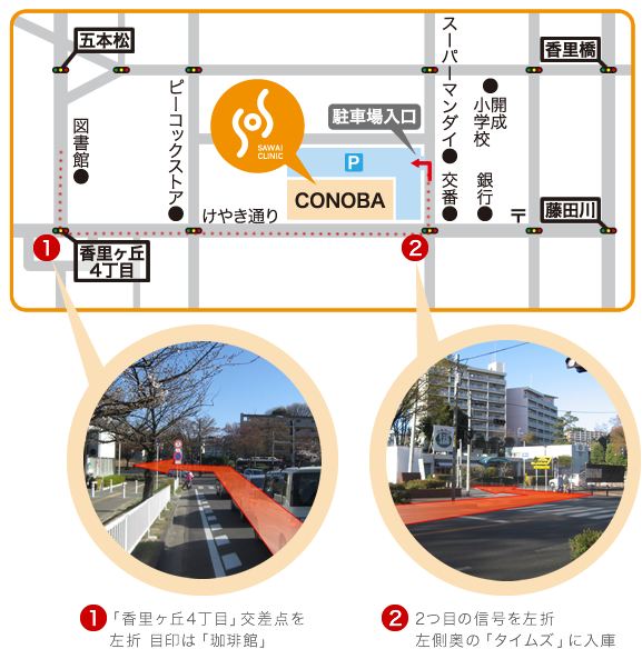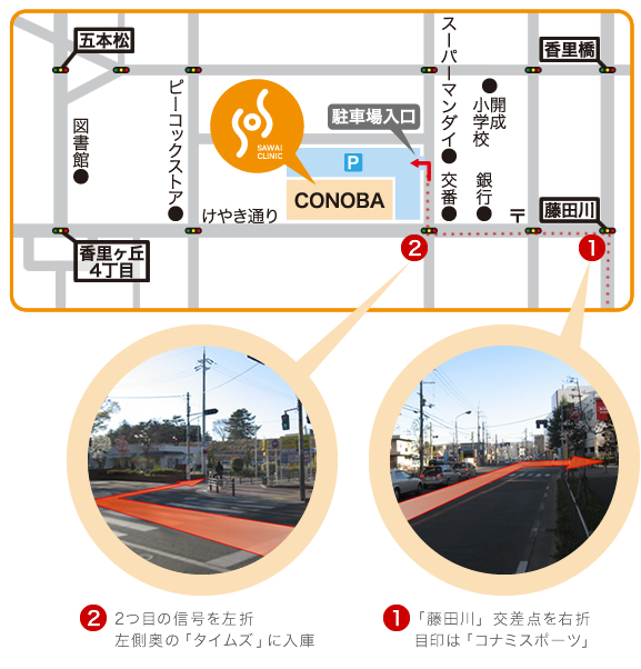 ※手前道路沿いの「タイムズ」はCONOBAの駐車場ではありませんので、割引特典の対象外です。ご注意ください。